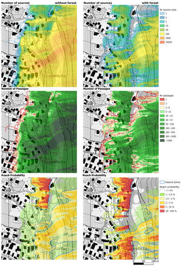 Visualisation of the emergence of low reach probability values below two or more superimposed release areas using simulations of the block volume 0.05 m3. Column left: Without forest, column right: With forest. Top row: number of source cells, middle row: number of simulated trajectories that passed per cell, bottom row: calculated reach probabilities. The corresponding explanation of the shown effect is given in the second last paragraph of the discussion.