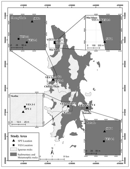 The scope of the current study was determined by taking into account the applicability of the non-invasive approach suggested in this work in civil engineering construction scenarios. The layout of the research areas is shown in Figure 1. The locations of the six VES stations and four SPT stations including 12 boreholes in Phuket that were used in this study are depicted. The VES locations were designed so that they were all close to the SPT points and appeared to be related to them. Table 1 and Table 2 provide information on data acquisition settings, measurement order, and depth selections for each profile.