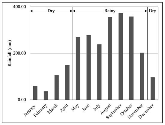 Area IV was chosen for examination because it has an igneous bedrock, whereas Areas I, II, and III have sedimentary and metamorphic bedrocks. In addition, the climate in the two distinct locations (Areas I–II and Areas III–IV) was divided into dry and rainy conditions, and the SPT N-value and VES data were examined in accordance with the corresponding geology and climate conditions, respectively. The average monthly rainfall distribution is shown in Figure 2. The study of this data condition increases the interest in the correlation between electrical resistivity and SPT N-value.