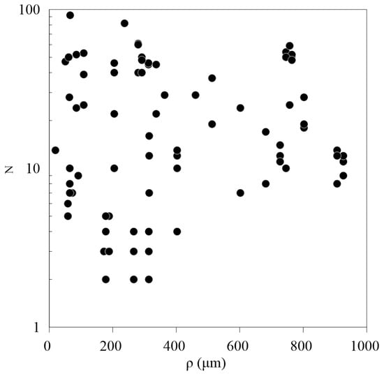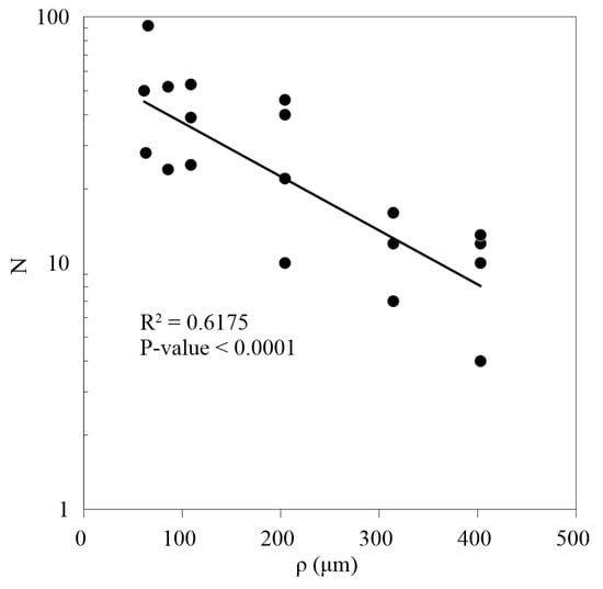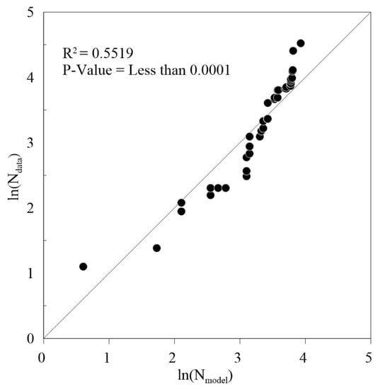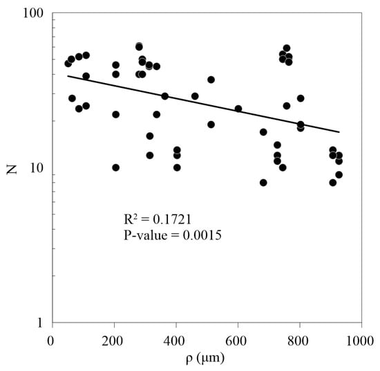 A lower value of R2 (0.0171), caused by geological differences and weather conditions, is indicative of this hypothesis. This finding is in good agreement with the study by Devi et al. []. They found that any correlation between electrical resistivity and the SPT N-value will be useless because the SPT N-value is unreliable in coarse sediments. Because the dispersed data for the SPT N-value and electrical resistivity can be decreased by the geological category and climate classification, it was reasonable to classify the data (both the SPT N-value and electrical resistivity) before the analysis.