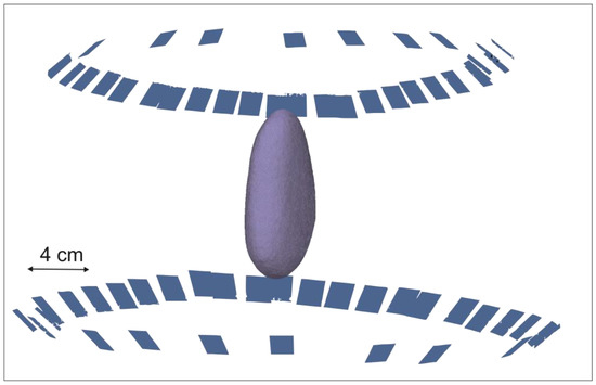 Given that the full surface of the model is required to be reconstructed, the object is imaged in two overlapping segments (Figure 2). Accordingly, for the image acquisition step, the object of interest was secured to the centre of the stage with modelling putty. The object was aligned with its longest axis () aligned vertically. Images were acquired approx. every 10 degrees (minimum) around the centre of the object. The camera was pointed obliquely towards the centre of the object for each image acquired. Each image also included the full stage where points to were included. A minimum of three of these points were visible in all images. The camera utilised during acquisition was from a Huawei P30 Pro which has three main lenses. The specifications of the lens utilised for this research are 40 MP, f/1.6, 27 mm. The images were acquired as *.raw which were subsequently converted to *.jpeg. Once completed, the object was removed from the stage and the model was turned ‘upside-down’ where the process was repeated resulting in two sets of image data for each ‘side’ of the object. This was to ensure that image data from the full surface of the object were acquired. Image position did not appear to have a considerable impact on the final point cloud. However, a systematic image acquisition survey was followed to ensure consistency in the results.