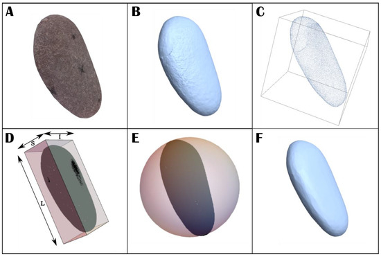 Figure showing different steps for shape and size calculation. (A) Sample S10 (from Figure 1); (B) resultant 3D model; (C) 3D point cloud; (D) minimum oriented cuboid over the sample; (E) smallest bounding sphere over the sample; and (F) 3D convex hull of the sample.