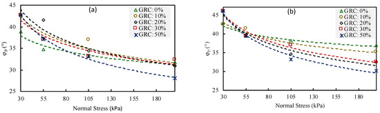 Figure 12 and Figure 13 present the results of φp and φr, respectively, for the different densities considered in this study. At all densities, the φp and φr decreased with increases in normal stress. In addition, the results indicate that, in the loose state, according to Figure 12a and Figure 13a the 20% rubber mixture had the highest φp and φr under different normal stresses. Furthermore, both φp and φr of the 50% rubber mixture were highly dependent on the normal stress, with the greatest decrease occurring as the normal stress increased. As a result, the behavior of mixtures of sand and rubber with a high percentage of rubber differs from those with a low percentage of rubber due to the compressibility of rubber.