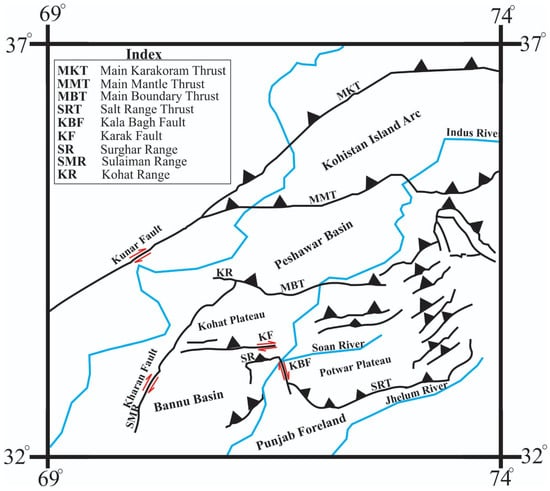 - Abbasi, I.A.; McElroy, R. Thrust kinematics in the Kohat Plateau, Trans Indus Range, Pakistan. J. Struct. Geol. 1991, 13, 319–327. [Google Scholar] [CrossRef]