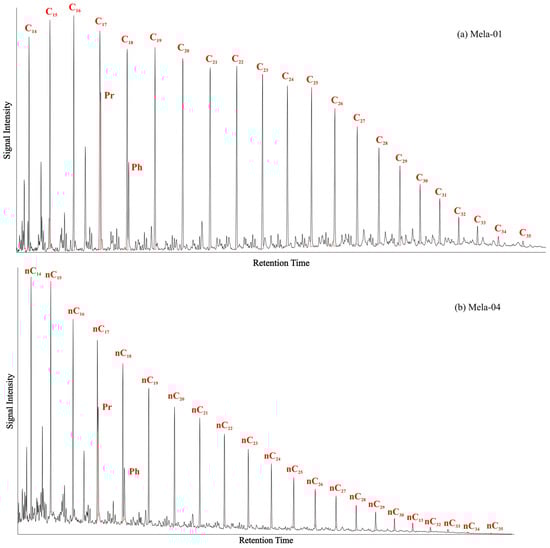 The CPI and terrigenous-aquatic ratio (TAR) of n-alkanes have values of 1.04 and 0.43, respectively, in Mela-01, whereas 1 and 0.13, respectively, in Mela-04 (Table 1), well indicate an almost mixed odd and even n-alkanes distribution [].