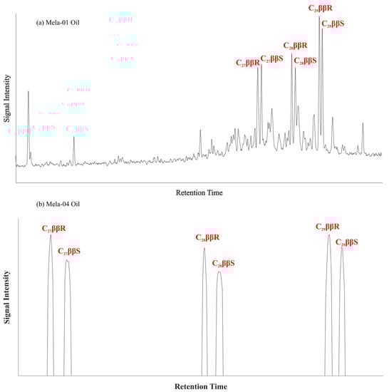 (a,b) Chromatograms showing distribution of C27, C28, and C29 steranes in the studied Mela oils from Kohat Basin.