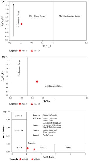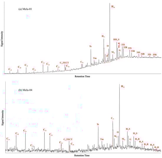 Marine carbonate source rocks can be differentiated from other lithologies by containing high C22/C21 and low C24/C23 tricyclic terpane values, so the calculated values of C22/C21 (0.24–0.26) and C24/C23 (0.81–0.82) indicate that the analyzed oils have not originated from other than carbonate lithologies, as suggested by Peters et al. []. The C35 HH is associated with a reducing environment, so the 0.89 value of C35/C34 HH for Mela-01 indicates a reducing depositional environment at the time of organic matter accumulation in the sediments, while its absence in Mela-04 may reflect oxidizing conditions [].