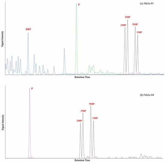 The aromatic compound dibenzothiophene (DBT) is sulfur containing, which is relatively abundant in marine carbonate and marl, while high phenanthrene results from precursors inherited from land plants []. Both the analyzed oil samples contain these aromatics in substantial amounts, with DPT/P 0.55 in Mela-01 and 0.31 in Mela-04 (Figure 5).