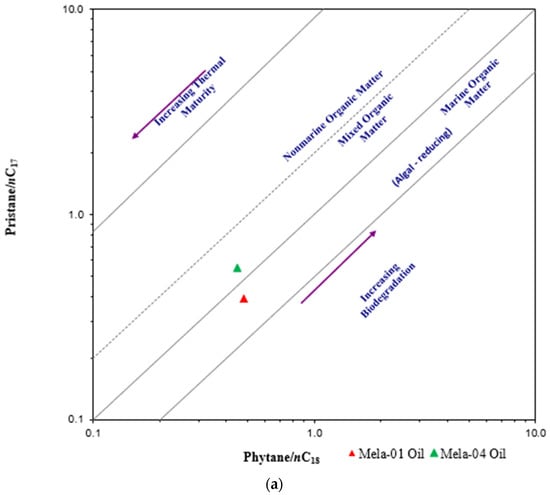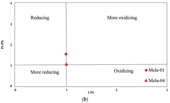 Pristane and phytane isoprenoids are the sources and best indicators of oxicity [,]. The calculated values of the isoprenoids Pr/Ph are 1.04 and 1.54 for Mela-01 and Mela-04, respectively, which indicate mixed sources of organic materials and sub-oxic conditions, as their values >3.0 represent oxic terrestrial organic matter, <0.6 anoxic, and the values in the range from 1–3 indicate sub-oxic conditions during deposition of sediments. However, Pr and Ph can also be influenced by thermal maturity [,,,,]. The high concentration of phytane represents either marine input and/or reducing conditions or thermal maturity because phytane is generated more rapidly than pristane during maturation [,]. Both pristane/n-C17 versus phytane/n-C18 and Pr/Ph vs. CPI plots proposed by Shanmugam [] and Peters and Moldowan [], respectively, indicate a mixed source of organic input in Mela-04 but comparatively more algal input in Mela-01 deposited in sub-oxic conditions (Figure 6a,b).