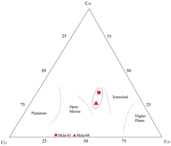The steranes and diasteranes biomarkers were also observed in the chromatograms (m/z 217 and 218) of the analyzed oil samples (Figure 3a,b). The measured C27 sterane value is 30.26% and the measured C29 sterane value is 38.39% in Mela-01, whereas in Mela-04 the C27 is 34.81% and the C29 is 35.5%, respectively (Table 1). Comparatively, the C29 land plant-related sterane is higher in Mela-01 relative to Mela-04.