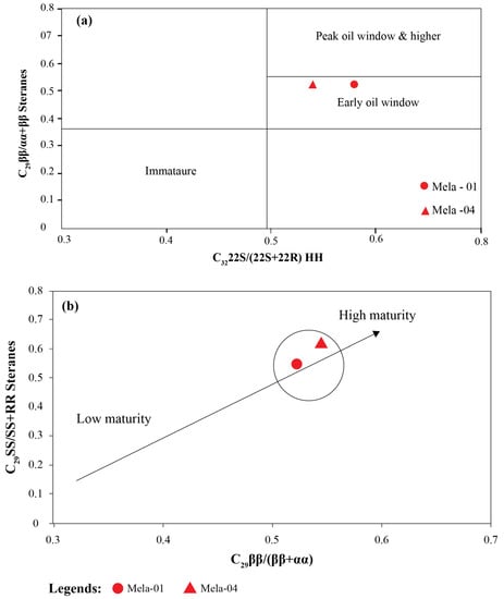 The C29 20S/(20S + 20R) sterane value increases from 0 to 0.5 with increasing thermal maturation of organic matter and attains equilibrium from 0.52–0.55, while at a 0.4 value, the onset of petroleum generation occurs, but Seifert et al. [] have noted lower values ranging from 0.23–0.29 in low-maturity oils. The present oils yield a value of this ratio ranging from 0.5–0.57, reflecting the oil stage of the source rocks (Figure 9b). This parameter is affected by the mineral contents of the source rocks too [,]. The C29 ββ/αα + ββ in another index of thermal maturity that is valid up to the peak oil window [] increases from 0–~0.7 and equilibrium is established at 0.67–0.7 and is not affected by the nature of organic matter as suggested by Seifert and Moldowan [], Welte and Tissot [], and Peters et al. []. This ratio found in the analyzed oils in the study area ranged from 0.5–0.52, indicating an early mature stage (Figure 9a,b).