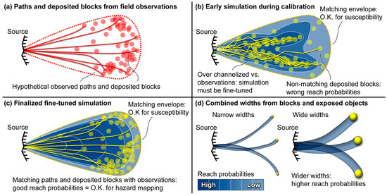 - Does the simulated envelope cover most of the mapped deposited rocks suspected to come from the same source(s) so that the results could be used for guiding susceptibility/indicative hazard zoning (e.g., the yellow vs. red dotted envelopes in Figure 1a–c)?