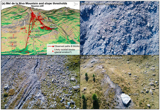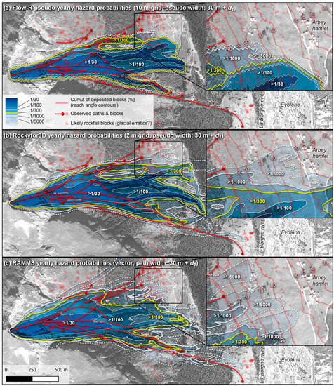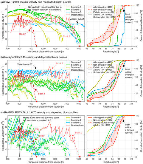 - Contrarily, are the simulated rocks deposited near mapped deposited ones in proportional numbers so that the simulations are statistically representative for quantitatively guiding hazard land use zonation and risk-assessment-related tasks (e.g., the yellow vs. red paths and blocks in Figure 1a,c)?