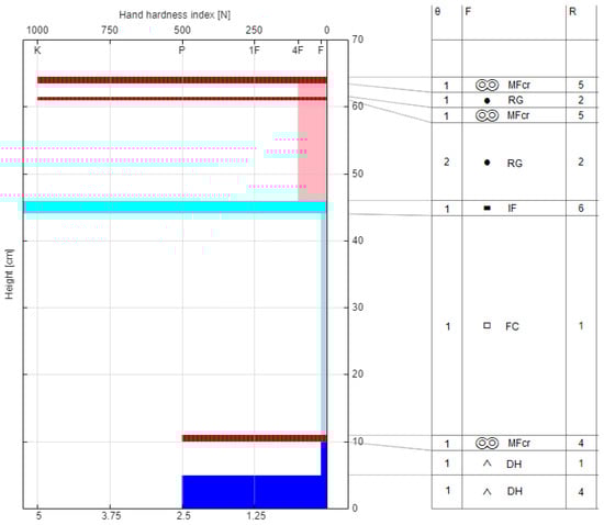 Stratigraphy of the snowpack. θ represents wetness, F represents grain type, and R represents the hardness of the snow, according to a classification in [25]. This visualization was created using the niViz tool.