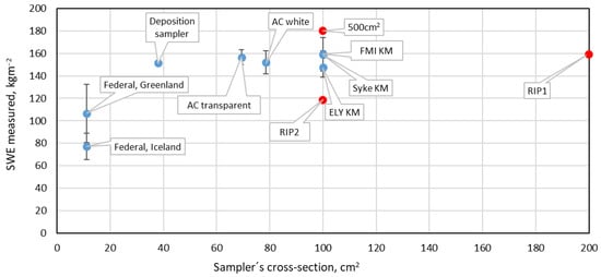 Dependence of the measured snow water equivalent on the sampler’s cross-section, measured using tube samplers (in blue) and density cutters (in red). The error bars indicate the standard deviations of the series, consisting of multiple samples taken using the same sampler.