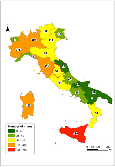 According to the Italian legislation (R.D. 1443/1927), a mine concerns the exploitation of materials of high value and strategic importance, such as ore minerals and fuel. Since 2006, ISPRA (Italian Institute for Environmental Protection and Research), which is responsible for the conservation and enhancement of the technical–scientific, historical–cultural and environmental heritage of mines, carried out (and constantly update) the “National Census of 2990 abandoned mining sites (from 1870 to 2006)” (Figure 1).