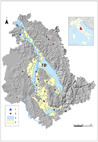 The Tiberino Basin (TB) is the largest of the intermountain basins (Figure 3), with an area of approximately 1800 km2 and a shape similar to an overturned Y.