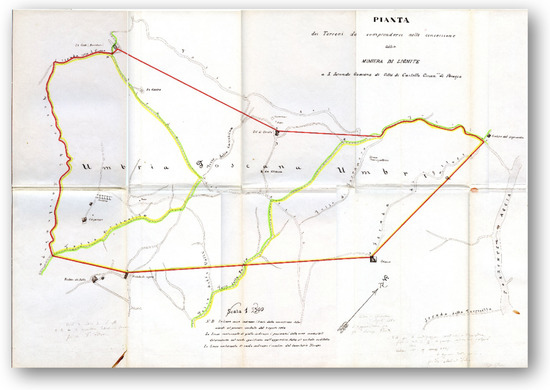 The georeferencing procedure for the ancient map in G.I.S. returned a good match. The perimeter of the concession area shown on the map overlaps almost perfectly with the reconstructed vector perimeter from archival documents. Analogously, the places indicated on the map coincide with the locations of the current localities. Information on wells and tunnels can therefore be considered as reliable. By using the G.I.S. results, we estimate an areal extension of approximately 62 hectares in the Umbria territory and 42 hectares in Tuscany. These values match the corresponding areas derived from the archival documents.