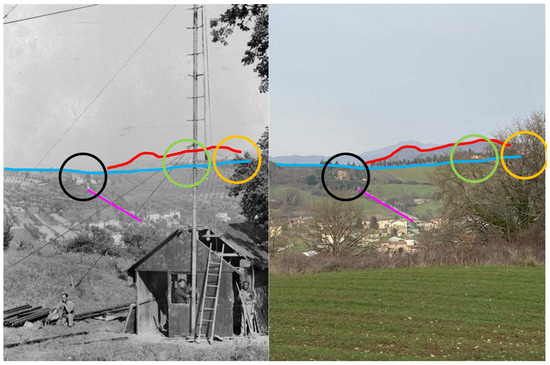 Comparison between a historical photo (archive G. Tacchini, 1940) and the current landscape in the Caiperino mine. The colored lines highlight the points of reference identified for the comparison between the two images and for defining the placement of the historical photo.