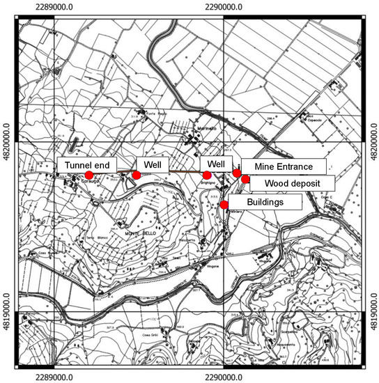 The beginning of the mining activity dates back to 1866 and lasted for 15 years; the mineralization was identified as a lignite bench that was 1.40 m thick. The area at that time was very isolated, lacking any major road to transport brown coal to Terni (the major steel production city in southern Umbria). In 1901, renewed interest in the mineralized area led to new exploration, and related documents describe the deposit in detail: “the lignite is in layers of blue marl, surmounted by a yellowish limestone sand. The strata have a dip direction equal to 55° N and a dip angle from 15° to 20°”. Attached to the report are detailed maps that show the old tunnel entrances and the location of the wells (Figure 4). In 1907, the mining activity was resumed and at least 200 tons of lignite were extracted in the Caiperino area while, in 1916, the area of Terranera produced 500 tons of lignite. Between 1917 and 1918, Austro-Hungarian prisoners present in the Upper Tiber Valley were employed in the mine. After a series of mining activities with a low income, the mine was definitively closed around 1945. There are no traces of the entrances, tracks and tunnels left.