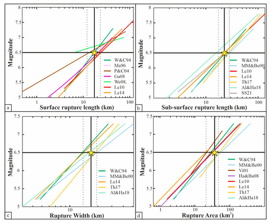 Linear regressions of (a) M vs. SRL; (b) M vs. L; (c) M vs. W; and (d) M vs. A. References’ acronyms as in Table 2. Yellow stars represent an earthquake with Mw 6.5; the vertical black line is the average value of seismic source geometrical parameters (SRL, L, W, A); vertical dashed black lines represent the variability of seismic source geometrical parameters (based on standard deviation values).