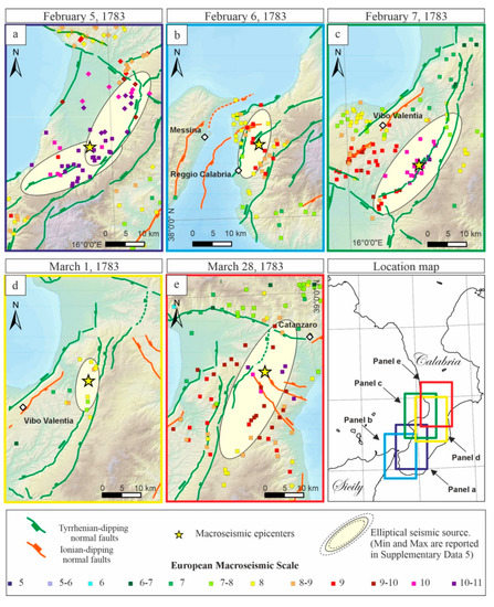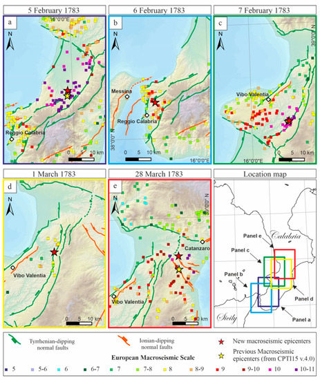 Detail of the epicentral areas of the 1783-SS macroseismic fields with previous and recalculated macroseismic epicenters and main active fault systems. (a–e) are the location of the events reported above the panels themselves. Note that the 6 February and 1 March events have no epicenter in the CPTI15 catalog.