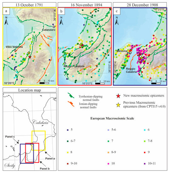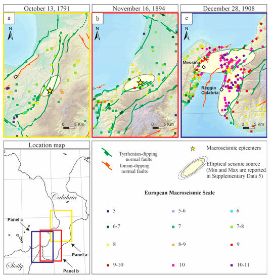 Detail of the epicentral areas of the 1791, 1894, and 1908 macroseismic fields. (a–c) are the locations of the events reported above the panels themselves.