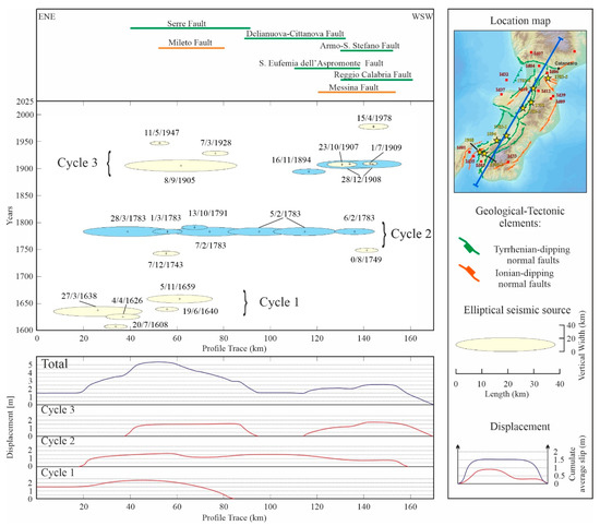 The Southern Calabrian Arc, located between the Catanzaro Basin and the Messina Strait, is the area of Italy with the highest seismic potential. In a time-lapse of 125 years, from 1783 to 1908, it experienced five events (e.g., 5 and 7 February and 28 March 1783, 8 September 1905, and 28 December 1908) with a magnitude greater than 6.5 ([1]), causing up to 100,000 casualties over an area extending ~130 km in the NE–SW direction along the mountain chain axis and, on average, 50 km perpendicular to it, from the Tyrrhenian coast to the Ionian coast (Figure 1).