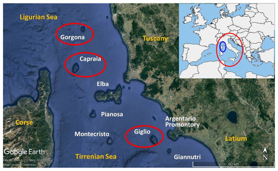 The Tuscan Archipelago lies between the Ligurian Sea to the north and the Tyrrhenian Sea to the south and between Corsica to the west and the Tuscan coast to the east. It is made up of seven major islands, Elba, Giglio, Capraia, Montecristo, Pianosa, Giannutri and Gorgona (in order of size), and several smaller ones (Figure 1).