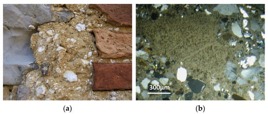 Of course, historical sources when present are the most accurate data regarding the supply of lime; nevertheless, when these are lacking or absent, the observation of mortars in thin sections under a polarising optical microscope (petrographic study) makes it possible to know the type of carbonate rock used in the production of lime and thus to have an indication of its provenance. Particularly, in the petrographic study it is necessary to examine both the lime inclusions, fragments that macroscopically show a whitish appearance, sometimes inconsistent, generically defined as “lumps” (Figure 2a) [14,15,16], and the texture of the binder.