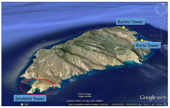 The Capraia island with the localisation of the three towers studied. The red circle indicates the Zenòbito shoshonitic volcanic event dating to the Pliocene (4.7 Ma) (from Google Earth (4 October 2013), 43°01′25.23″ N, 9°49′01.56″ E, Eye alt. 2.28 Km, Landsat, SIO, NOAA, U.S. Navy, NGA, GEBCO 2013, [5], modified).