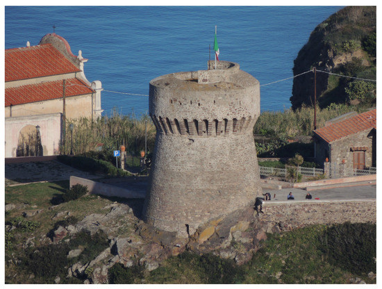 The island belonged to the Republic of Genoa from the 14th century to the end of the 18th century. During that period, after the destruction perpetrated by the Ottoman corsair Dragut in 1540, the Banco di San Giorgio supported the renovation and expansion of the fortress built by the Pisans (St. George fortress) and the construction of the towers of Porto (1541) to defend the bay and prevent the landing of enemy ships (Figure 4), and of Zenòbito (1545) in the southern tip of the island.