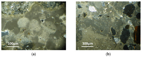 This indicates that we are in the presence of a magnesian binder obtained from the burning of dolomite/magnesian limestones. Indeed, this is confirmed by the presence of under-burnt fragments of dolomitic rocks (Figure 5b) [24].