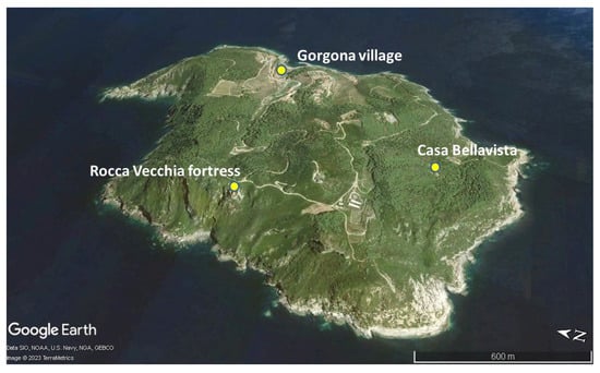The Gorgona island with the localisation of Rocca Vecchia (from Google Earth (10 August 2019), 43°28′04″ N, 9°54′59″ E, Eye alt. 3.27 Km, TerraMetrics, SIO, NOAA, U.S. Navy, NGA, GEBCO 2023, [5], modified).
