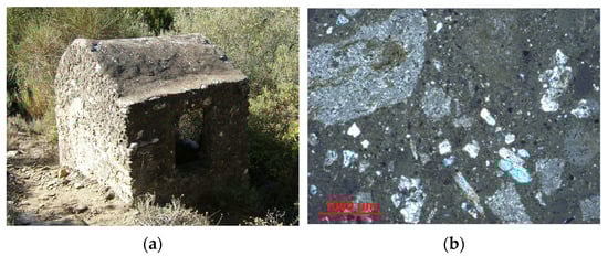 (a) “Palmento”, masonry structures of modest dimensions for the pressing of grapes, from where mortar samples were taken. (b) Bedding mortar of a “palmento” with dolostone and marble fragments in the aggregate (image at the optical microscope in thin section, crossed polarised light).