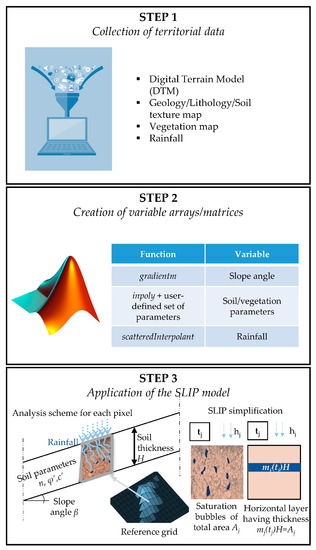 One of the most effective PBM, even simplified, is SLIP (Shallow Landslides Instability Prediction); its simplification is on the time-dependency of soil saturation on rainfall: saturation immediately increases because of infiltration (static rate) but then decreases due to runoff (dynamic rate). Despite its simplicity, SLIP showed interesting predictive skills in different territories and at different scales of analysis [51,52,53,54,55,56,57]. It was even adopted by DEWETRA, i.e., the multi-risk platform of the Italian Department of Civil Protection, for pre-alert purposes (analyses with recorded rainfall related to past events) [54]. Gatto and Montrasio [58] presented a MATLAB platform named X-SLIP, where the SLIP model is implemented, and stability can be assessed over large areas with easily available territorial data. However, until now, X-SLIP showed its effectiveness when applied with recorded rainfall; to use it in regional LEWS, it must be enabled to perform real-time predictions of future events, with stability analyses based on rainfall forecasts.