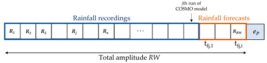 As previously discussed, SLIP analyses are based on a simplified hydrological model, expressed by Equation (3); this evaluates the soil’s saturation varying with time depending on the rainfall occurred on a rainfall window RW preceding the generic event eP when stability is analysed (RW = 30 days, according to [62]). For real-time predictions of future events, such RW must include forecasted data, as well as recorded ones; the final structure of the rainfall array is illustrated in Figure 3. Note that it deals with a “cell” array, storing matrices in each position. To investigate the influence of the forecast window in X-SLIP real-time predictions of past events, the final part of the rainfall array must be, therefore, filled with forecast data i of the jth COSMO run suitably selected (rain forecast from tfj,1 to tfj,i, with i depending on the chosen forecast window).