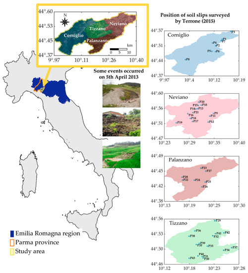 The Emilia Apennines, i.e., the northern Apennines located in the Emilia Romagna region (north of Italy), are particularly landslide-prone due to the weak lithology (mainly arenaceous and calcareous flysch, with widespread clayey components) and the presence of groundwater [69]. In April 2013, about 1500 events were detected in this area, triggered after a long and intense rainy period from March to the first ten days of April; such phenomena caused major inconveniences, such as damage to crops, settlements and road disruptions, so that a state of emergency was declared to guarantee the essential level of public services. Based on well-recognised classifications, types of rainfall-induced shallow landslides can be debris slides or debris/earth flow. In the former, slides occur along only one interface, whilst in the latter, there are relative movements in numerous layers of the involved mass. The SLIP model, based on the infinite slope scheme, is suitable to analyse, with good approximation, the initiation mechanism of all the mentioned types. To validate the proposed update of the X-SLIP platform, real-time predictions are simulated on four of the involved towns, all located in the Parma province: Neviano degli Arduini, Corniglio, Tizzano Val Parma and Palanzano. There, Terrone [70] detected 43 soil slips on 5 April 2013 at 12 p.m.; such information is used to evaluate the prediction quality of X-SLIP hindcasts. Figure 4 shows the study area and the positions of the surveyed phenomena, together with some photos representative of the types of phenomena that occurred.