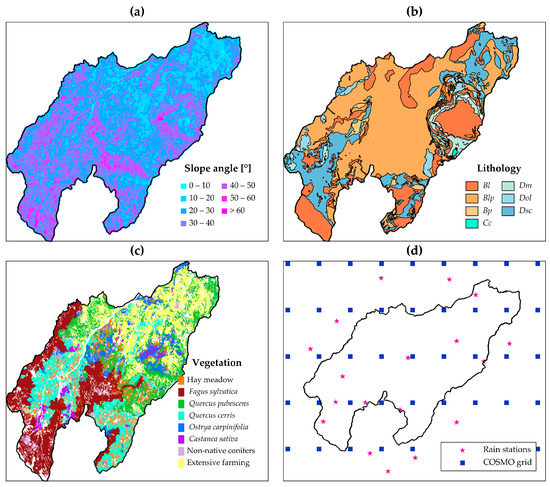 Raw data for X-SLIP analyses. (a) Slope angles; (b) lithologies; (c) vegetation species; and (d) points of COSMO grid and rain stations, respectively, related to forecasted and recorded rainfall.