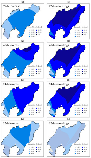 Comparison of forecast and recorded rainfall cumulated on: (a) and (b) 72 h; (c) and (d) 48 h; (e) and (f) 24 h; (g) and (h) 12 h.