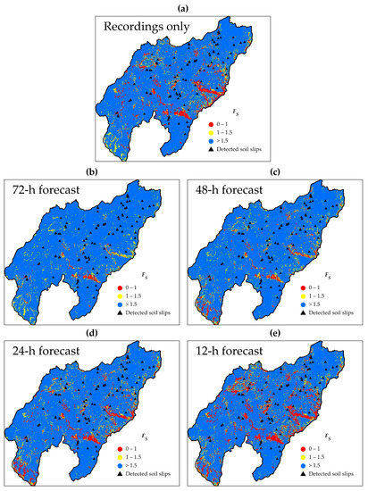 Figure 8 reports the results of stability analyses performed via X-SLIP on 5 April 2013 at 12 p.m., grouped considering FS less than 1 (unstable pixels), between 1 and 1.5 (critical pixels) or greater than 1.5 (stable pixels); soil slip points surveyed by Terrone [70] are also plotted for a qualitative comparison. The target outcome is represented by factors of safety FS evaluated with the recordings only (Figure 8a); as already observed by Montrasio et al. [59], in this case, almost all the detected instabilities are captured (pixels with FS less than 1). Figure 8b–e illustrate the maps obtainable if X-SLIP had been run on: 2 April 12 p.m. (72 h before, Figure 8b), 3 April 12 p.m. (48 h before, Figure 8c), 4 April 12 p.m. (24 h before, Figure 8d), 5 April 12 a.m. (12 h before, Figure 8e). In some areas, instabilities could be efficiently predicted three to two days before the occurred event; however, the most encouraging result is derived a day before, when predictions are surely very close to the target result for the whole study area. This means that for the case in question, 24 h would have been adequate to enable authorities to raise an alert or take the necessary steps to avoid inconvenience.