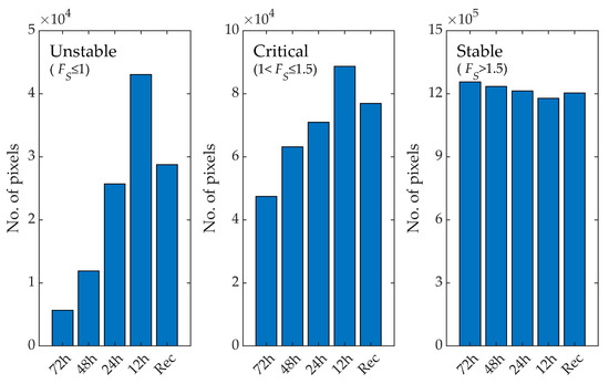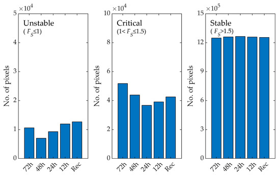 Maps of the computed factors of safety are shown in Figure 12. It can be observed that in all cases, most of the pixels have FS greater than 1; this confirms the absence of any report of occurred events. There are small zones occupied by red pixels in the southwest and the east part, which can be attributed to a bad X-SLIP prediction or could actually have been instabilities not detected because not involving the built environment. The amount of unstable, critical and stable pixels (Figure 13) evidence that the unstable pixels are around 10 k, i.e., less than 1% of the total number of pixels (1,319,976). A majority of pixels are stable, with a quite high percentage of critical pixels due to the temporal proximity of the landslide day. Even in this case, there is a good agreement between the space-time prediction derived via X-SLIP a posteriori (with recordings only) or a priori (with forecasts) for early warning purposes.