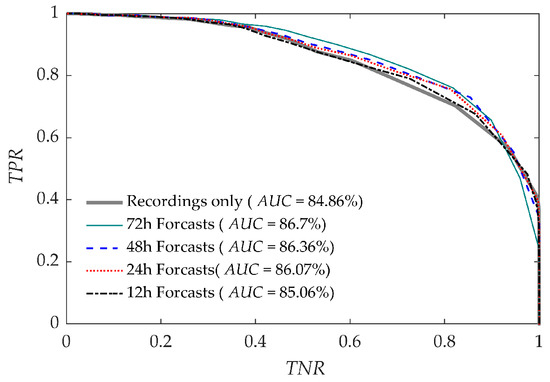 The ROC curve is defined by changing FS,TH from 0 to 70 and deriving the corresponding TPRs and TNRs; then, the prediction quality is evaluated through the Area Under the Curve (AUC), i.e., the integral of the ROC curve. Figure 10 shows the ROC curves for all the cases analysed, together with the corresponding AUC. It is interesting to observe that the curves derived from analyses with rain forecasts are quite coincident with the ones with recordings only, and the AUC is greater than 80% in all cases. This proves not only X-SLIP accuracy (already clear from previous studies conducted with only rain recordings) but also the stability of the SLIP model itself even in real-time predictions, performed with forecast rain. Note that the AUC is maximum with 72 h forecasts because of fewer unstable pixels and consequently FPs.