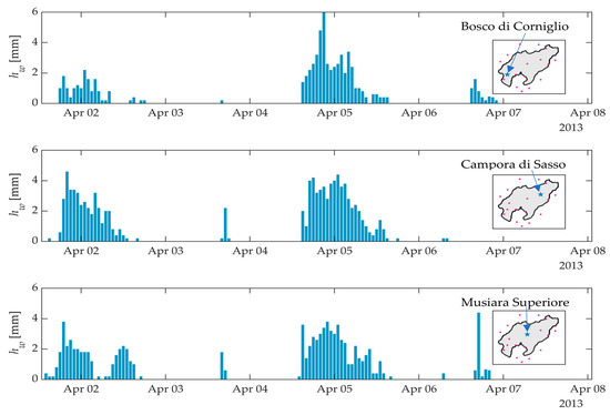 X-SLIP accuracy in time prediction is, here, investigated on a non-landslide day, i.e., when it is not aware that soil slips were triggered despite intense rainfall. By analysing the rainfall trend shown in Figure 11, related to three rain stations along a diagonal line crossing the study area, a peak comparable with the triggering one (5 April) is noticed on 2 April. Further, X-SLIP hindcasts of real-time predictions are, therefore, conducted on this event, with all data previously discussed, including the cases analysed (Table 1), but with the run of the COSMO model and the dates of rain recordings properly shifted and selected.