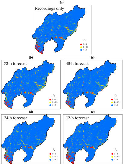 Maps of FS evaluated on 5 April 2013 at 12 p.m. with (a) only recorded rainfall (X-SLIP run after the event occurrence); (b) recorded and 72 h forecast rain (X-SLIP run three days before the occurrence); (c) recorded and 48 h forecast rain (X-SLIP run two days before the occurrence); (d) recorded and 24 h forecast rain (X-SLIP run one day before the occurrence); (e) recorded and 12 h forecast rain (X-SLIP run 12 h before the occurrence).