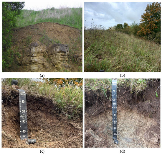 (a) Ordovician limestones overlapped by local carbonate moraine, central part of Izhora Upland (Ordivician Plateau); (b) alvares (dry herbaceous vegetation communities) of Izhora Upland; (c) rendzic leptosols on hyperskeletic debris of limestones, Izhora Upland, (d) rendzic leptosols, Izhora Upland; (e) leached rendzina on deep weathered carbonate debris, Izhora Upland; (f) umbric albeluvisol on deep leached and weathered carbonate moraine, Borovitchy, Novgorod region.