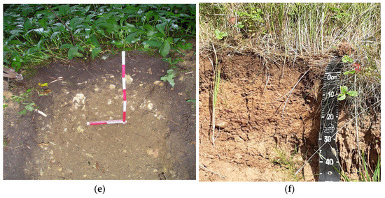 The morphological organization of natural rendzinas of the Northwest Russian Federation is presented in Figure 2. Figure 2a shows two soil-forming rocks simultaneously—limestone and the local carbonate moraine overlaying it. In this case (Leningrad region), the thickness of the local carbonate moraine is tens of centimeters to the first and second meters; the moraine is very strongly enriched in carbonates and is characterized by the weak leaching of carbonates. Figure 2b shows typical plant communities—alvares, which Nitsenko [14] characterized as steppe meadows, i.e., a peculiar intrazonal vegetation type. To the south, in the Pskov and Novgorod regions, carbonate moraines are more leached and thicker, which contributes to the formation of more differentiated soil profiles (Figure 2e). Thus, the degree of development of the soil profile and its vertical differentiation is closely related to the degree of decarbonatization and leaching of the initial parent materials. The area differentiation of soil types shown in Figure 1 is also related to this. The more northern soils of the northwestern region contain more carbonate, except for those confined to the Shelon and Msta rivers in places of erosion in their watersheds of hard calcareous rocks. Loamy sediments of older, southern marginal moraines of the early Valdai age contribute to residual carbonate umbric albeluvisols (retisols) rather than rendzinas formation.
