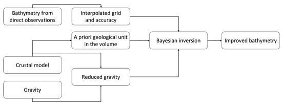The proposed methodology to improve bathymetry modeling, compared to the standard described in Section 1.1, has a more linear workflow. A schematic representation of the new workflow is reported in Figure 1. As a first step, direct bathymetric observations are used to compute an initial map of the seafloor over a certain study area; this can be done by means of a kriging algorithm [10] or a least squares collocation algorithm [11]. Note that both the interpolation algorithms also provide an estimate of the accuracy, in terms of STD, of the obtained grid. From a statistical point of view, we can expect the actual bathymetry to be in the range ± 3 times the STD from the estimated grid. This information is used to define the a priori bathymetry and its range of variability within the Bayesian inversion.