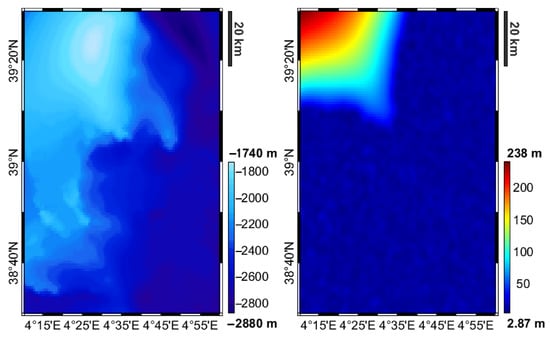 We started from the latest GEBCO bathymetry model [12] on the considered region. Looking at the TID grid reported in Figure 2-right, we can note that all the eastern part of the region is covered by direct bathymetry observation (TID = 17 means, in fact, “Combination of direct measurement methods”), while the remaining part (TID = 41) is just a mathematical interpolation. This is, in fact, one of the regions where the classical method presented in the Introduction is known to fail. The area was chosen because it is characterized by large variations in bathymetric depths (between 1000 m and 2900 m), and a large part of the region is well-known from direct observations. In this study, in order to mimic a real case situation, we considered as known the whole bathymetry as a part of a region in the northwest corner where depths are smaller than 2000 m. In this way, we removed part of the data where the bathymetry was available from direct observations. We used the proposed methodology to re-estimate the bathymetry, and we evaluated the quality of the results by comparing the obtained map with the bathymetry derived from direct measurements.