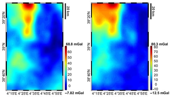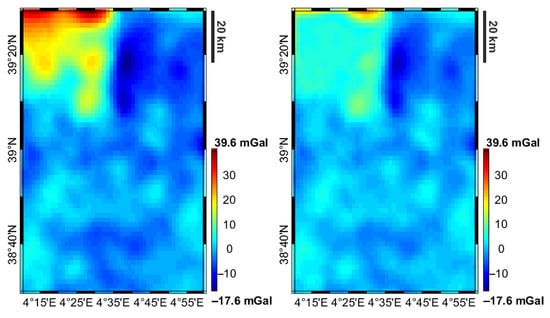 We fixed the maximum depth of the model built to perform the inversion at 3200 m. We then removed from the XGM2019e gravity model, synthesized in terms of gravity anomaly at zero level, the gravitational effect of the density variations around and below the study volume. For this purpose, we exploited the 3D crustal model of the whole Mediterranean region obtained in the European Space Agency XORN project [15]. The resulting gravitational field is shown, together with the original free-air anomalies, in Figure 4.